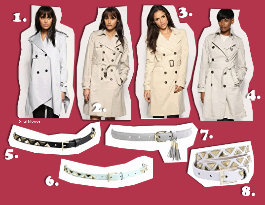 To buy: 1. ASOS Long swing mac - £70.00 2. Mango belted trench - £84.90 3. ASOS Straight shoulder pad mac - £65.00 4. Gap linda trench - £74.00 5. ASOS Triangle studs skinny waist belt - £12.00 6. ASOS Triangle studs coloured skinny waist belt - £12.00 7. ASOS Tassel Detail Suede Look Waist Belt - £10.00 8. ASOS Triangle Studs Natural Skinny Waist Belt - £12.00