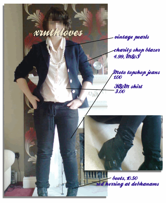 So we have the £1 topshop jeans from a carboot sale, the £10.50 boots reduced from £45 (which KILL but i still wanna wear them..), vintage pearls passed down my family, charity shop blazer originally from Marks and Spencer which i got for £4.99, H&M nude shirt which i got for £3 but was originally £15. Basically, all of my clothes are reduced and cheap aha!!