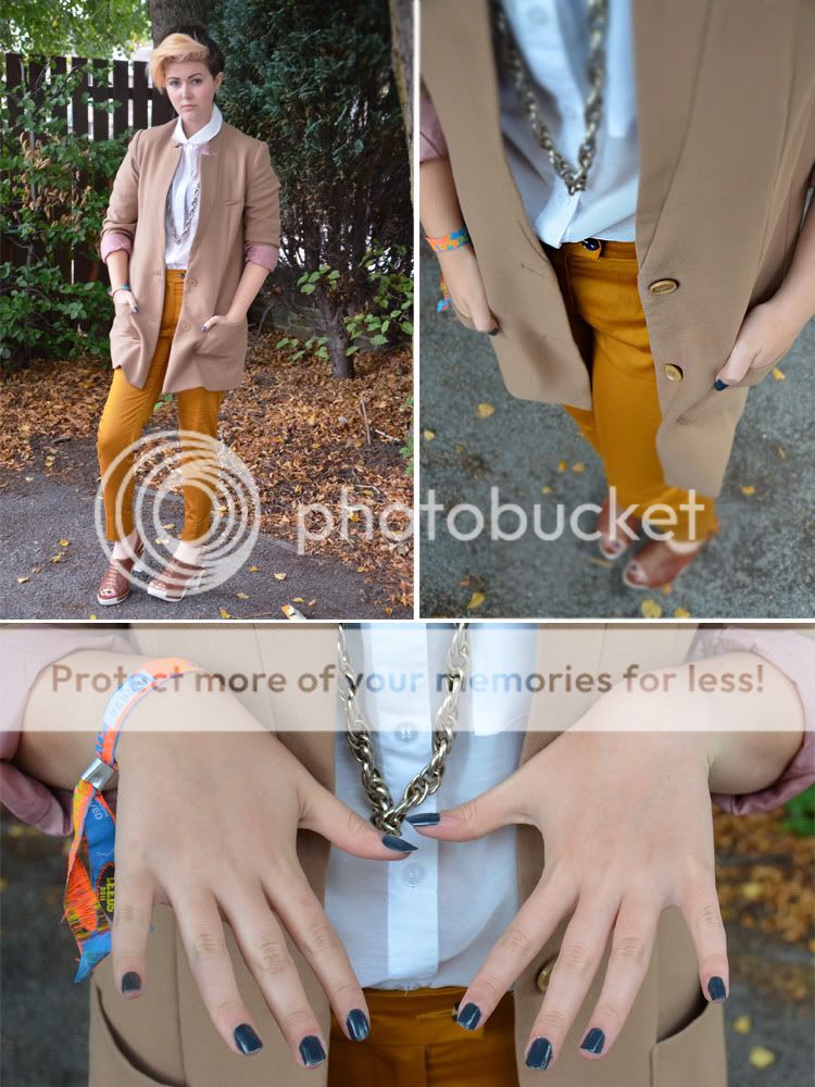 H&M mustard trousers - £12.99, which I think are sold out.. if you can get a pair, grab them! H&M sheer shirt - £9.99 H&M blazer - £24.99 Gold chain - £4, Primark (feel like the fresh prince of bel air when I wear it...) Leather clog heels - £16.99, was £40, Bershka