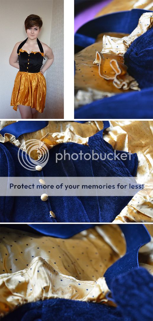 Now, I'm not a massive fan of using photos of myself on my blog, but the photos just didn't do the dress justice on a hanger. Also, I apologise for the awful lighting, I had to edit the photos lots to get them to remotely look okay, which has resulted in the dress looking blue, and me with a slight alien-like glow... It's not, it's black velvet, and I'm not an alien. It has a gorgeous, gold polka-dot silk bottom and bust trim, with matching buttons. Really comfy too, with the zip back and elasticated waist. The halter neck is detachable, but I thought it looked better up. It was really lovely actually, the woman who was on the tills & runs the shop explained that the lady who brought it in (that same day), explained that it was hers a good 30 or 40 years ago. I love it when amazing little finds have a nice story behind them. The dress, vintage, £3.